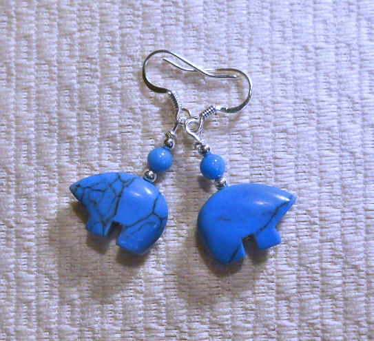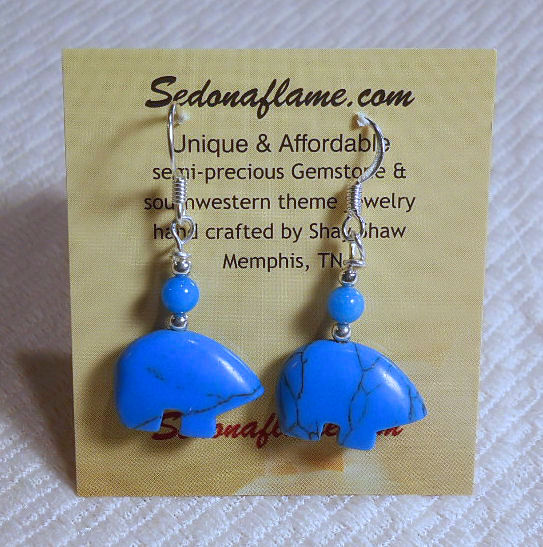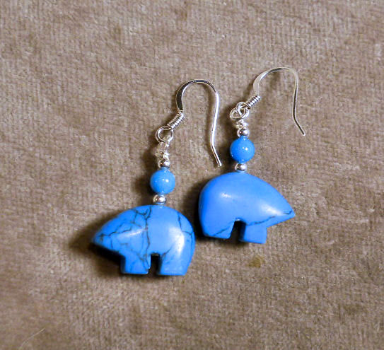 These southwest style earrings are designed using hand carved simulated Turquoise zuni bear beads. They are topped with 4mm dyed mountain jade beads