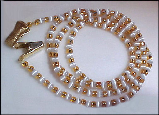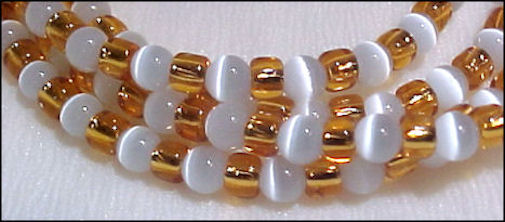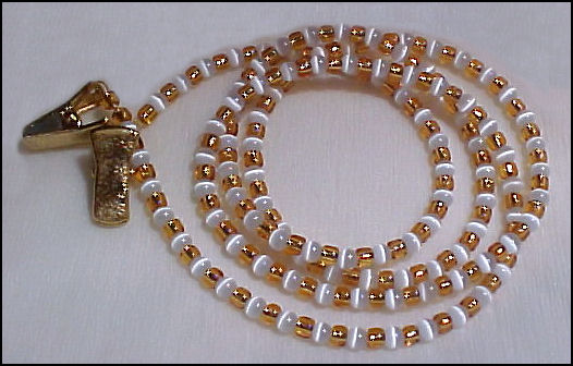 ITEM: White Cats eye & Gold Eyeglass Chain Fiberoptic CATS EYE Eyeglass chain made with Gold silver-Lined Beads make this one sparkle! LENGTH: standard eyechain measures 28" to 29" long PRICE: $19.00 with Gold Grips as shown ($16.00 with clear loop ends) My eyeglass chains are handcrafted using semi-precious gemstones, quality glass beads, pinshell heishi, sterling or gold plated beads, stone fetishes or Fimo beads. Eyechains are strung on durable 21 or 49 strand jewelers wire. The end loops are available in 2 styles - rubber with adjustable slide coil or "alligator clip" ends (additional charge). If at any time for some unforeseen reason one of the ends should break, I will gladly replace the ends free of charge if shipped to me with $2.50 for return shipping/handling. If you wish to mail payment and not use the shopping cart, just send an email and list the ones you want to order. I will email you the total due and payment address. 21 -strand Beadalon® Wire is used for stringing eyechains. Beadalon® allows designs to drape naturally, without kinking. The fine strands of stainless steel wire are stranded together and then nylon coated. This beading wire is considered the strongest, most flexible wire available. It is superior for holding its shape and resisting kinks. |
