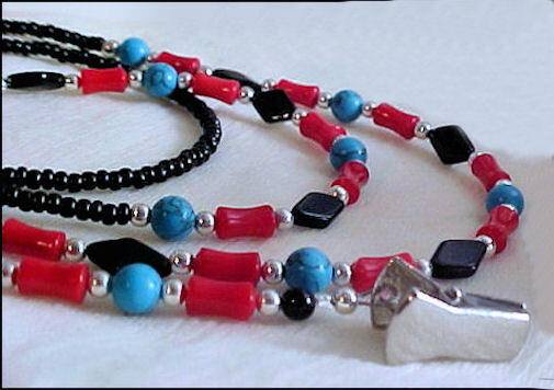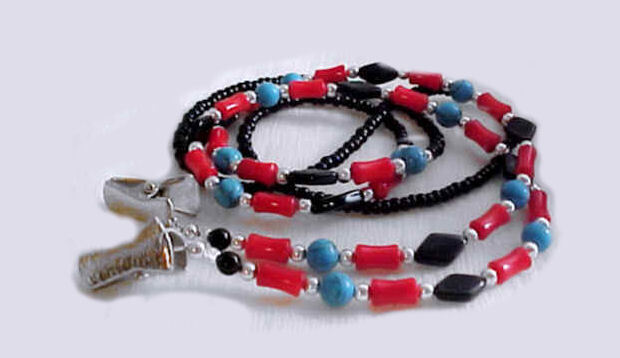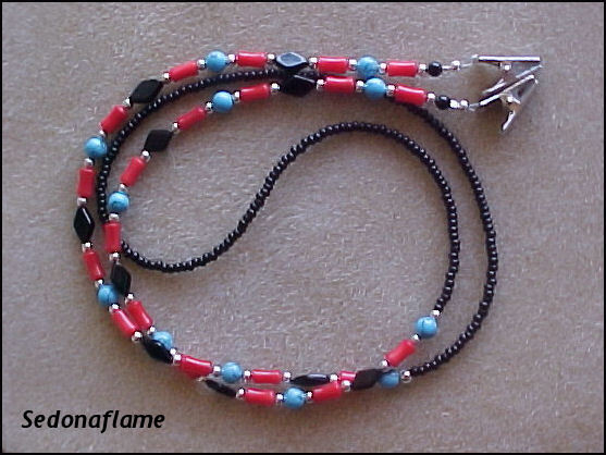Coral Tube Eyeglass Chain #0712ec4 Coral Tubes strung with blackstone diamond shape, Turquoise round beads, with black seed beads LENGTH: eyechain measures 29"-30" long PRICE: $21.00 w/ loop ends ($23.00 with Grip Ends as shown) Pictures reflect style. As some eyechains are made at time of order, there may be small variations. All beads are handcut, so sizes and shapes may vary from those shown