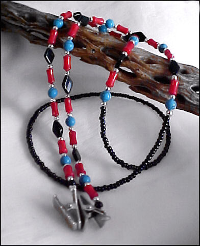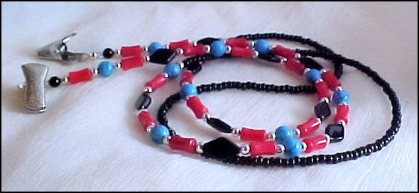 My eyeglass chains are handcrafted using semi-precious gemstones, quality glass beads, pinshell heishi, sterling or gold plated beads, stone fetishes or Fimo beads. Eyechains are strung on durable 21 or 49 strand jewelers wire. The end loops are available in 2 styles - rubber with adjustable slide coil or "alligator clip" ends (additional charge). If at any time for some unforeseen reason one of the ends should break, I will gladly replace the ends free of charge if shipped to me with $2.50 for return shipping/handling. If you wish to mail payment and not use the shopping cart, just send an email and list the ones you want to order. I will email you the total due and payment address. 21 -strand Beadalon® Wire is used for stringing eyechains. Beadalon® allows designs to drape naturally, without kinking. The fine strands of stainless steel wire are stranded together and then nylon coated. This beading wire is considered the strongest, most flexible wire available. It is superior for holding its shape and resisting kinks. |