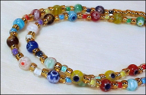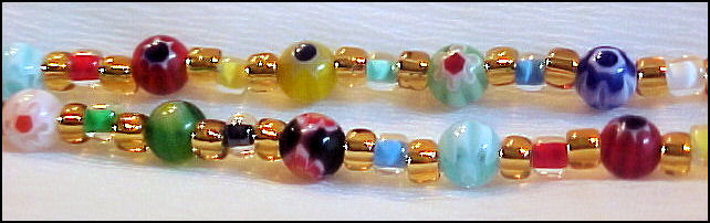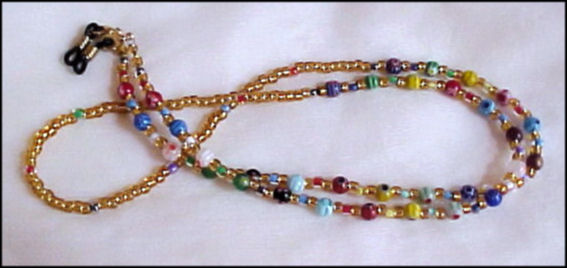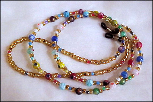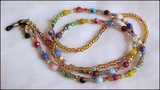 Millefiori Lampwork Multi Color Round Bead Eyeglass Chain in GOLD Back to GALLERY OR Back to Alphabetical List