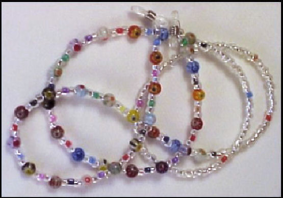 My eyeglass chains are handcrafted using semi-precious gemstones, quality glass beads, pinshell heishi, sterling or gold plated beads, stone fetishes or Fimo beads. Eyechains are strung on durable 21 or 49 strand jewelers wire. The end loops are available in 2 styles - rubber with adjustable slide coil or "alligator clip" ends (additional charge). If at any time for some unforeseen reason one of the ends should break, I will gladly replace the ends free of charge if shipped to me with $2.50 for return shipping/handling. If you wish to mail payment and not use the shopping cart, just send an email and list the ones you want to order. I will email you the total due and payment address. 21 -strand Beadalon® Wire is used for stringing eyechains. Beadalon® allows designs to drape naturally, without kinking. The fine strands of stainless steel wire are stranded together and then nylon coated. This beading wire is considered the strongest, most flexible wire available. It is superior for holding its shape and resisting kinks. |