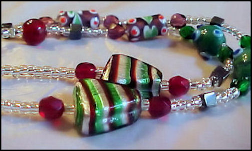 Va Va Voom! Glass Bead Eyeglass Chain PHOTOS REPRESENT STYLE * Item shown is a SAMPLE to reflect style* The Exact item shown is SOLD- new orders will be made in the same style but may have different colors of the barrel & round lampwork beads than shown in photos (the striped Triangle bead will remain) DESCRIPTION: Colorful assortment of handmade glass beads strung on 49 strand acculon nylon coated jewelers wire Beads used: Triangle Foil maroon, silver and green striped* Round bumpy' lampwork * lampwork floral barrel beads * * various colors of Czech 6mm fire polished faceted rounds and hematite 4mm cubes with Silver lined crystal seedbeads. LENGTH: eyechain measures 28" long PRICE: $18.00